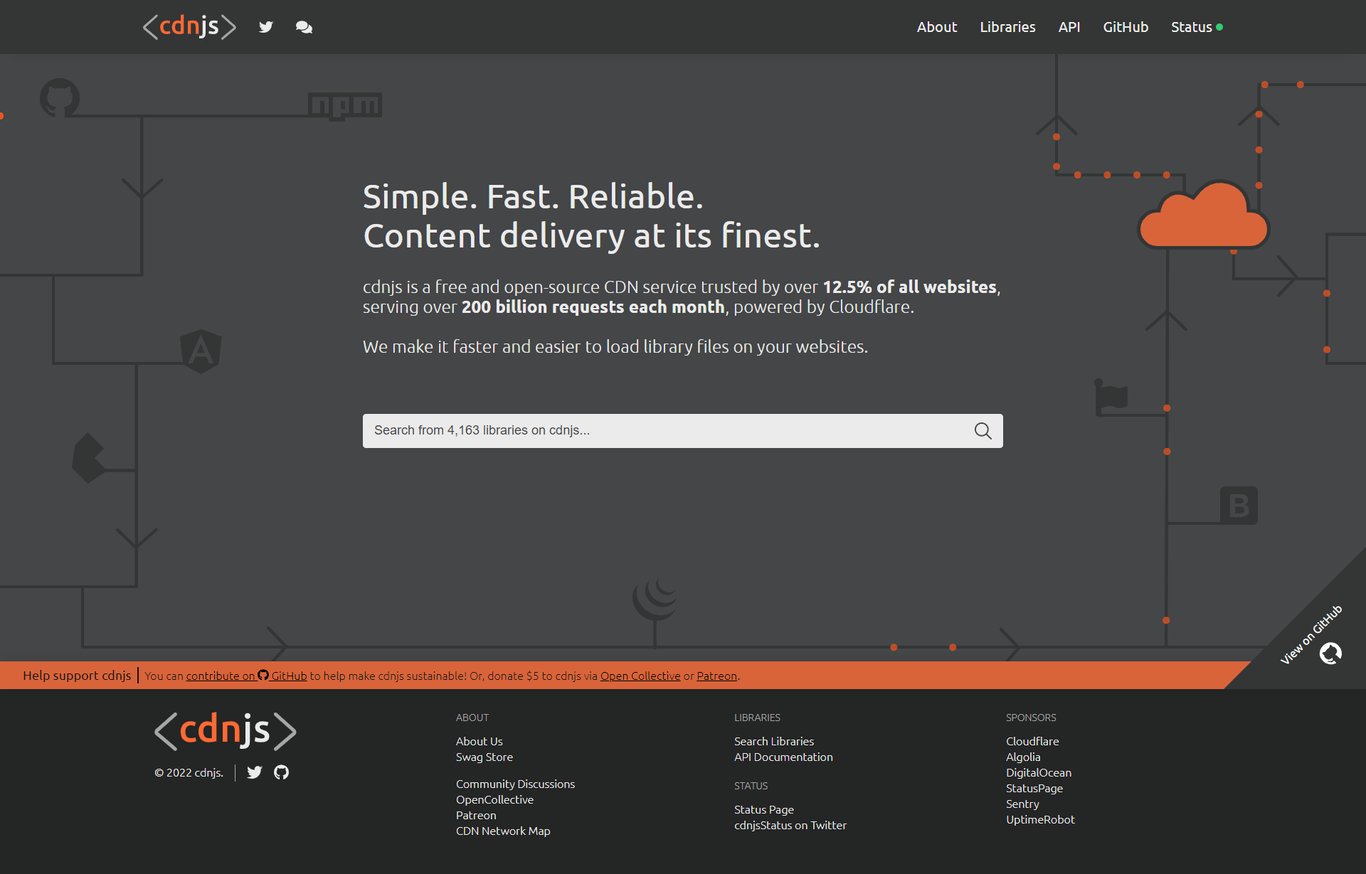 Simple. Fast. Reliable. Content delivery at its finest. cdnjs is a free and open-source CDN service trusted by over 12.5% of all websites, serving over 200 billion requests each month, powered by Cloudflare. We make it faster and easier to load library fil