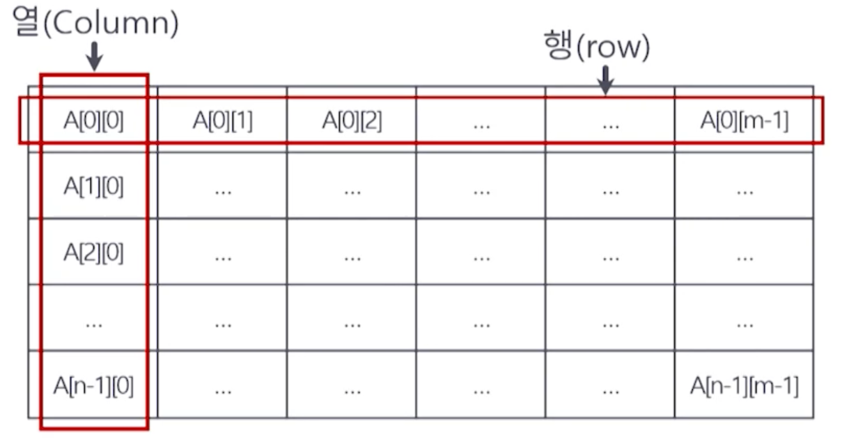 - 가로의 1차원 배열 단위로 메모리 영역을 우선 할당함