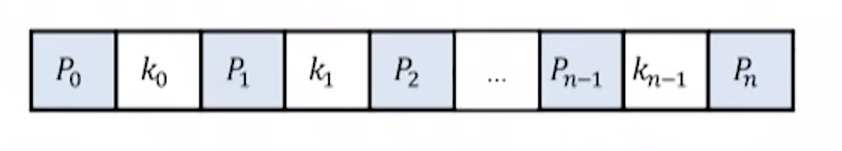 - 노드 구조는 다음과 같다. 여기서 P0 ~ Pn 은 서브 트리에 대한 포인터 이고 K0 ~ Kn-1 은 키값이다. 또한 n ≤ m - 1 이 성립한다.