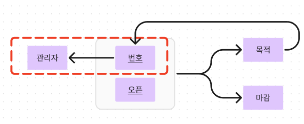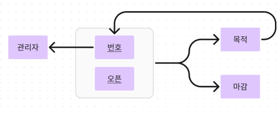 | 번호 | 오픈 | 마감 | 목적 | 관리자 |