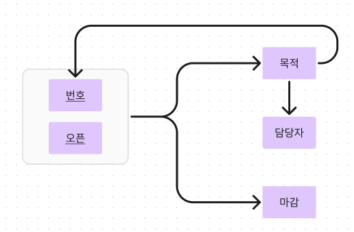 | 번호 | 오픈 | 마감 | 목적 | 관리자 | 담당자 |