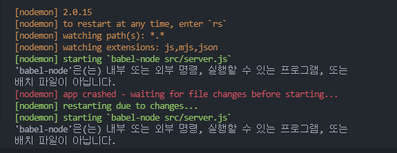 - babel-node 파일의 경로 및 존재여부가 정확하지 않음.