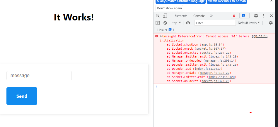 - 메세지 입력 시 h3 으로 출력이 되야 하는 부분에서 출력이 안되는 상황 발생.