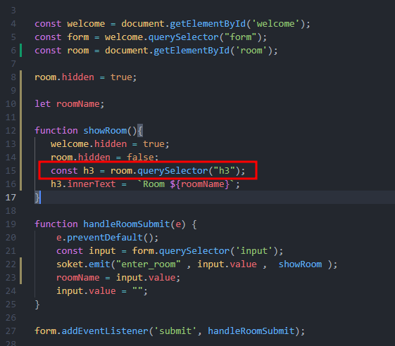 - const h3 = room.querySelector("h3") 으로 수정해주기
