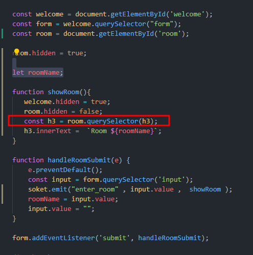 - const h3 = room.querySelector(h3) 부분에서 h3의 "" 가 없어 인식을 못함.