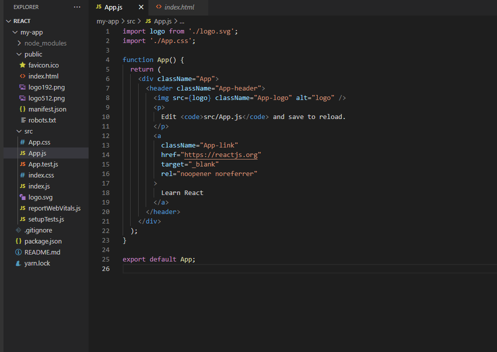 App.js return 함수를 확인하면 HTML 코드와 같은 형식으로 작성이 되어있다.