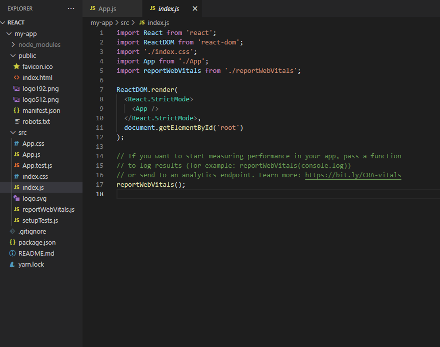 index.js 파일이다. App.js에 생선된 리액트 코드를 출력하고 그 코드를 index.html로