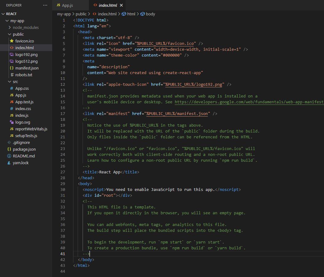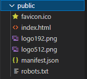 node를 통해 package.json 안에 저장 된 패키지들을 불러 올 수도 있다. - public : static 자원폴더, 실제 html이 구현 되는 폴더로 보면 편하다. 리액트는 가상DOM 을 이용하여 부분 부분 나눠서 구현을 하는데, 그 부분에서 실제 DOM 역할을 해주는 html이 있는 폴더다.