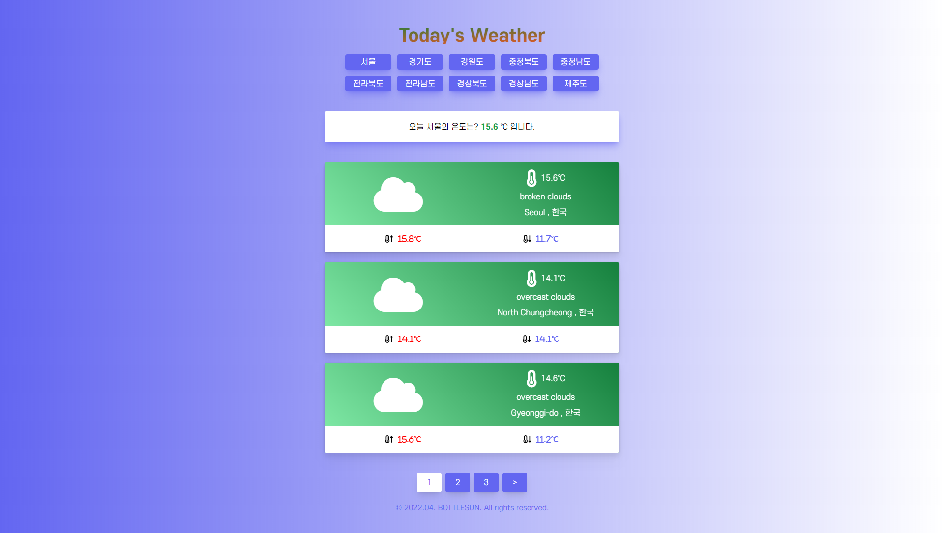 버튼 클릭에 따라 해당 지역의 현재온도를 가지고와 출력해줬다.