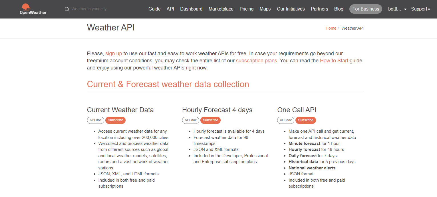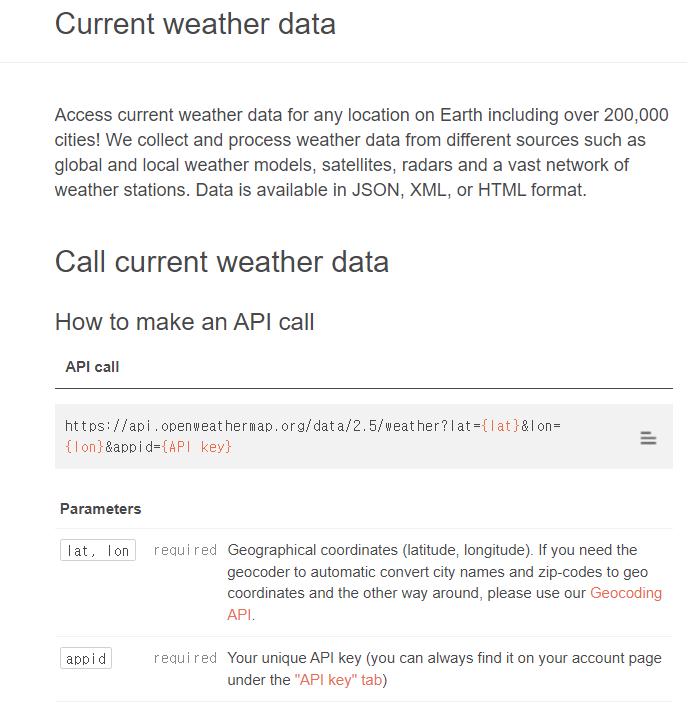 해당 사이트에서 날씨 데이터를 받기위해 필요한건 회원가입후 생성하는 APIKEY , 원하는 위치의 자리의 좌표가 필요하다고 나온다.