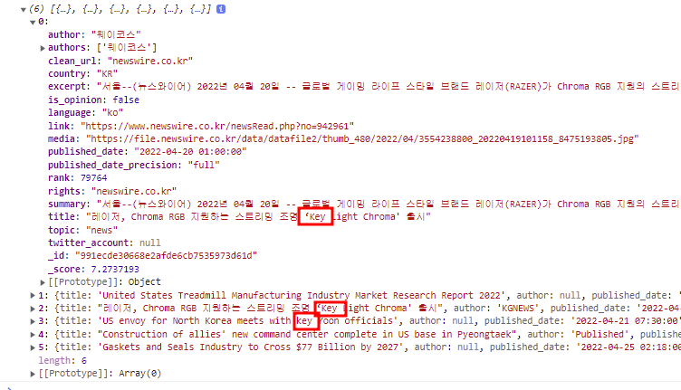 뉴스 API 내장 기능으로, q='입력 할 키워드' q에 매개변수를 넣어주면, 해당 keyword가 포함된 뉴스 내용들을 전부 json 값으로 가지고 올 수 있다.