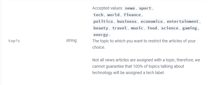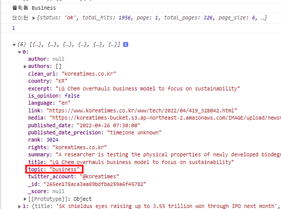 api 내부 json 데이터들의 대분류를 지정하여 topic에 매개변수로 해당 topic 키워드를 넣어주면, 해당 topic인 값들만 출력해줄 수 있다.