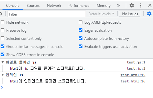 인라인 태그나 js파일을 불러와가지고 사용된 스크립트들의 내용은 똑같이 console에 출력이 되는것이 확인 된다.