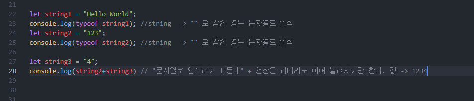 문자열로 인식하기 때문에 string2 값인 123에 string3 값인 4를 더할 경우 값이 127이 아닌 문자 "123" + 문자 "4" 의 합인 1234가 출력 되게 된다.