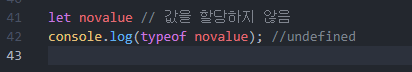 값을 할당하지 않은 변수나 값을 의미하는데 null과 다르게 undefined는 자료형 구조에 값이 비어있는게 아니라 존재하지 않는 값이라는 의미로 인식하고 지정하게 된다.