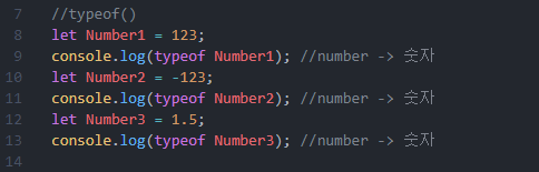 자바스크립트에서는 숫자형 같은 경우는 정수든 소수든 전부 number 로 인식한다.